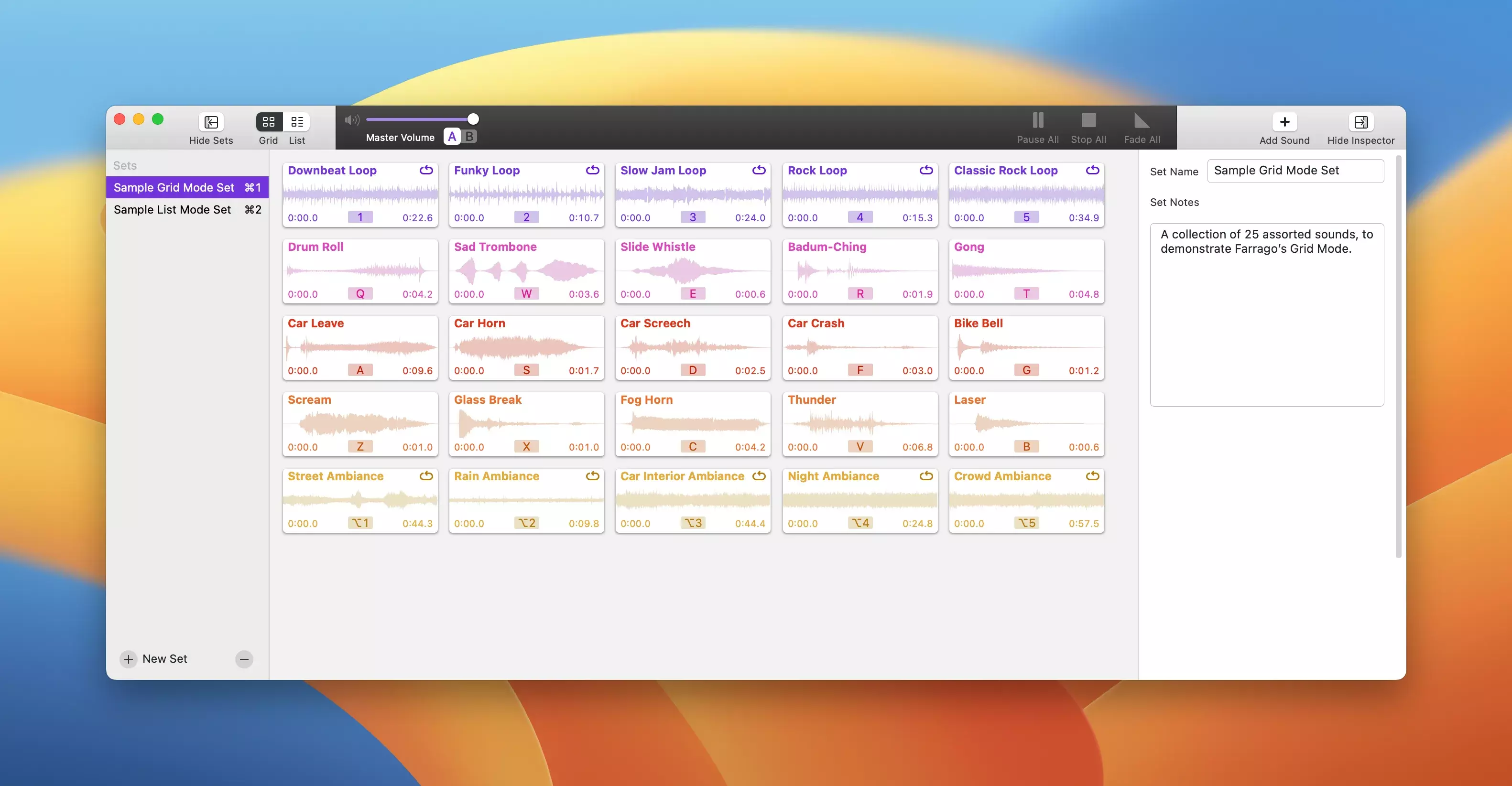- 音量和输出控制:Farrago的主音量开关支持静音播放,每个瓷砖的输出控制可将声音发送到指定位置。