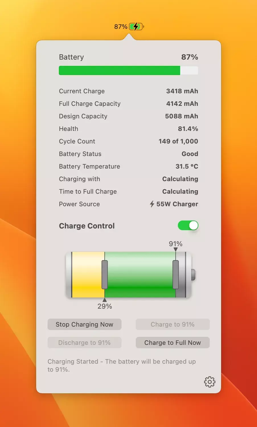 充电控制不仅可以让您自动控制充电。随时按下按钮,您甚至可以开始充电和放电(需要苹果 M1 芯片或更高版本)。也许您知道在接下来的一天里无法为 MacBook 充电。没问题,只需按下“立即完全充电”按钮,在稍等片刻后,您就能拥有一个完全充满的电池了。