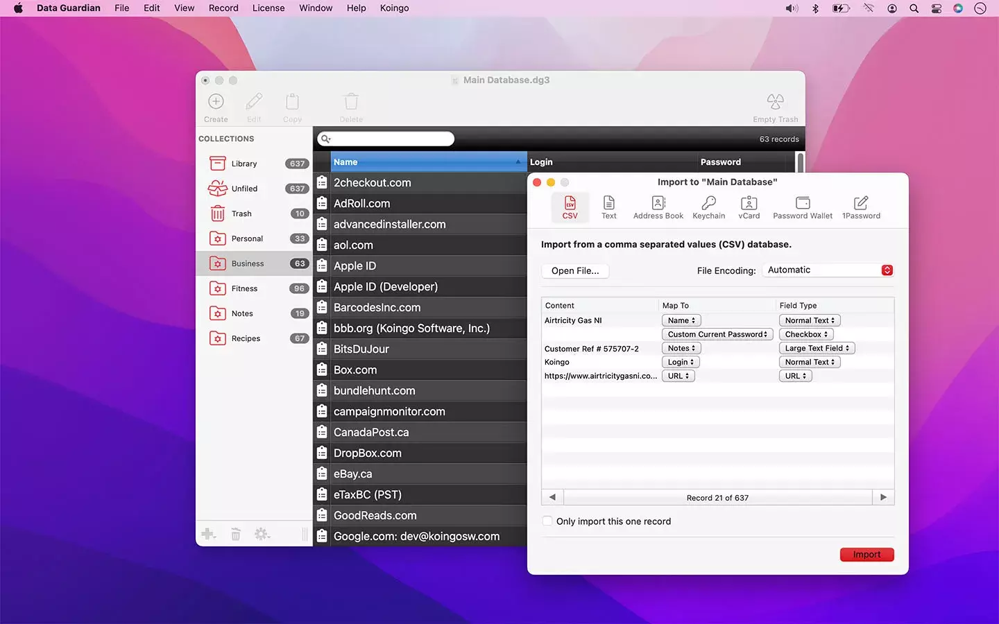 Data Guardian 7 是一款功能强大的安全应用,能够保护您的登录信息、密码、地址、笔记、信用卡号码、收据等资料,使用高达 448 位的 Blowfish 加密技术,确保数据的安全性和隐私性。其灵活直观的设计使用户可以轻松输入和管理各种数据,适用于需要高安全性的个人和专业用户。