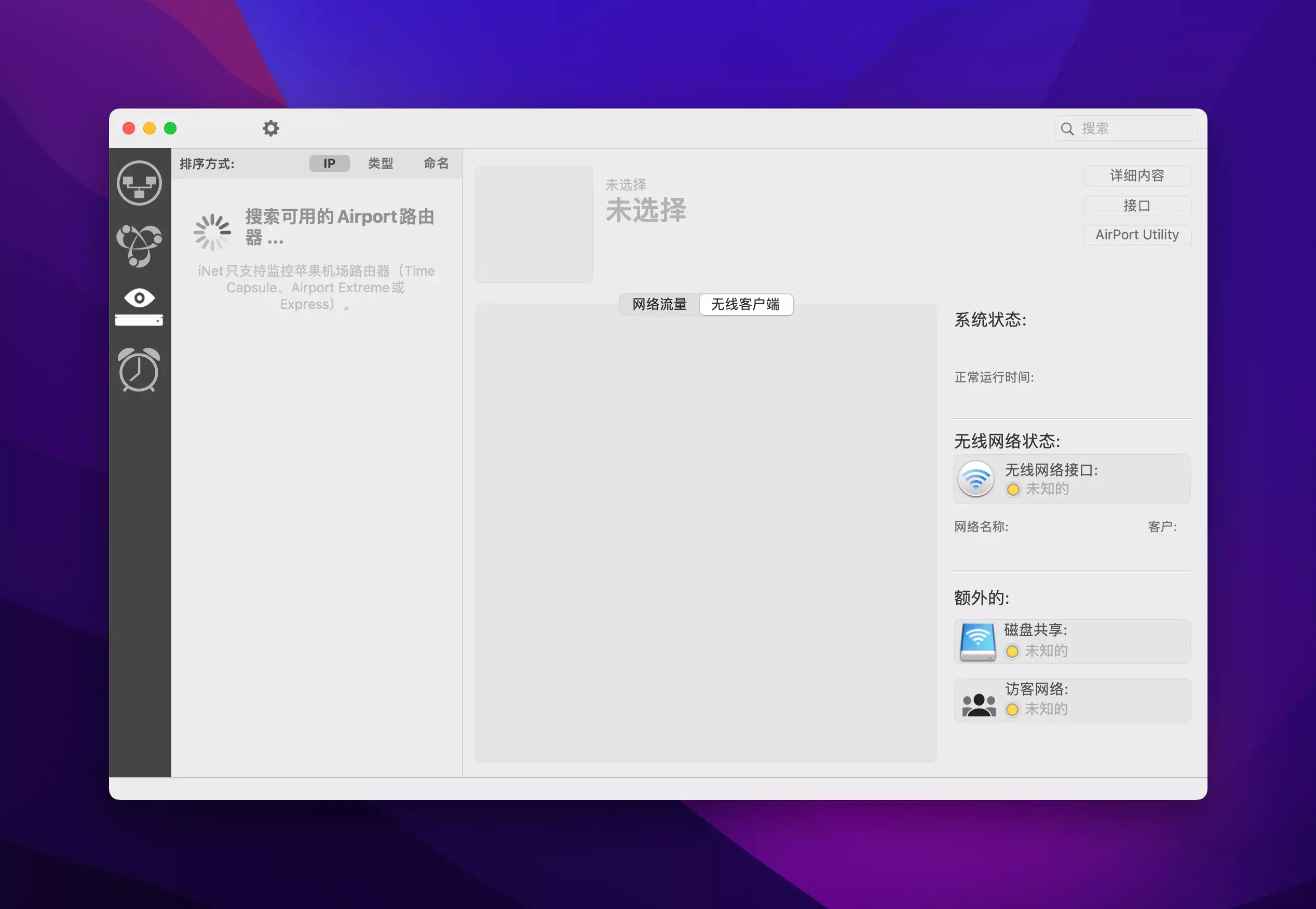 - 有关 Apple Airport 基站的详细信息,如 MAC 地址、IP、使用的信道等。