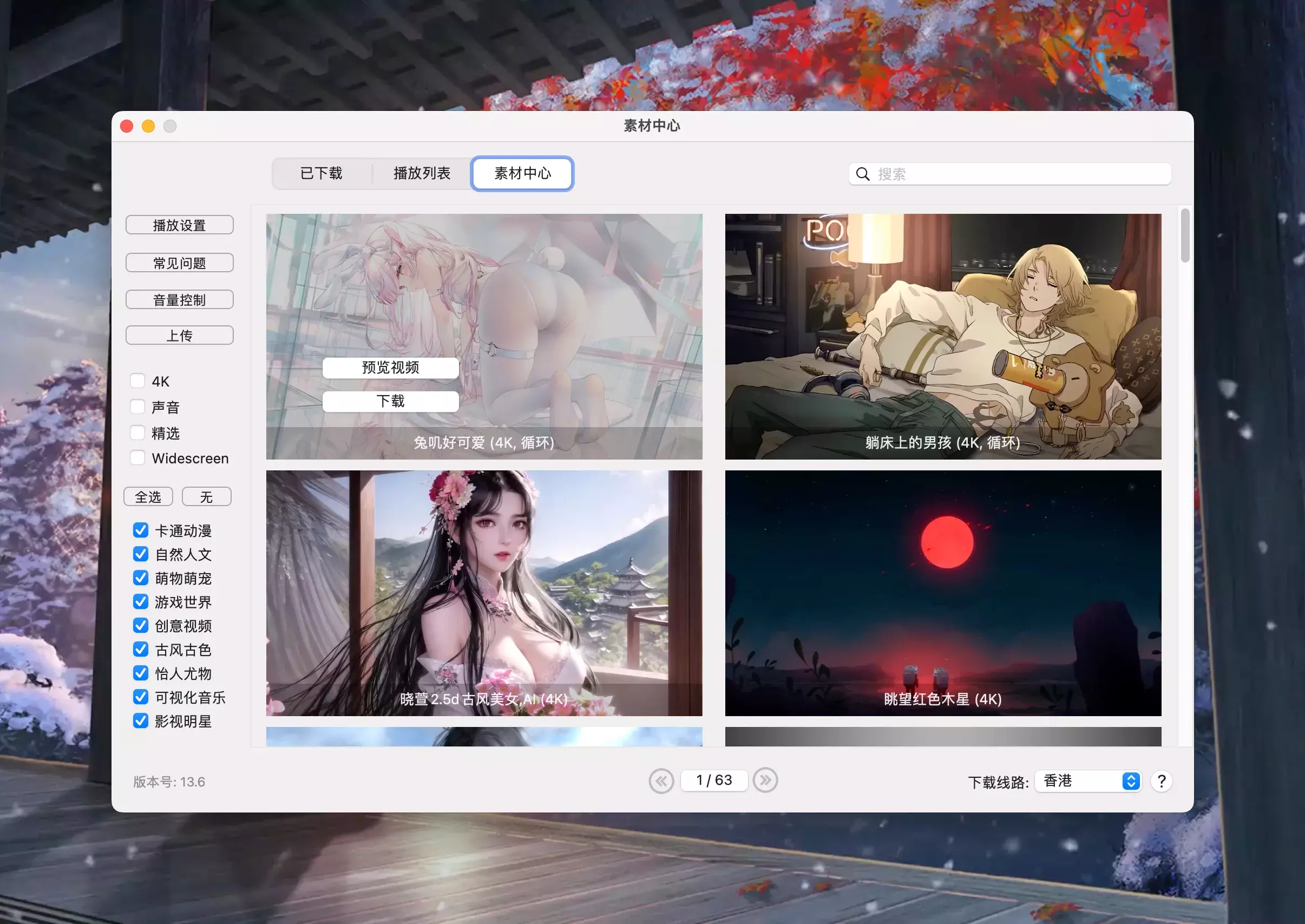 - 视频素材分类:4K超清、卡通动漫、自然人文、萌宠萌物、游戏世界、创意视频、怡人尤物、古风古色、影视明星等等,总有适合你的风格。