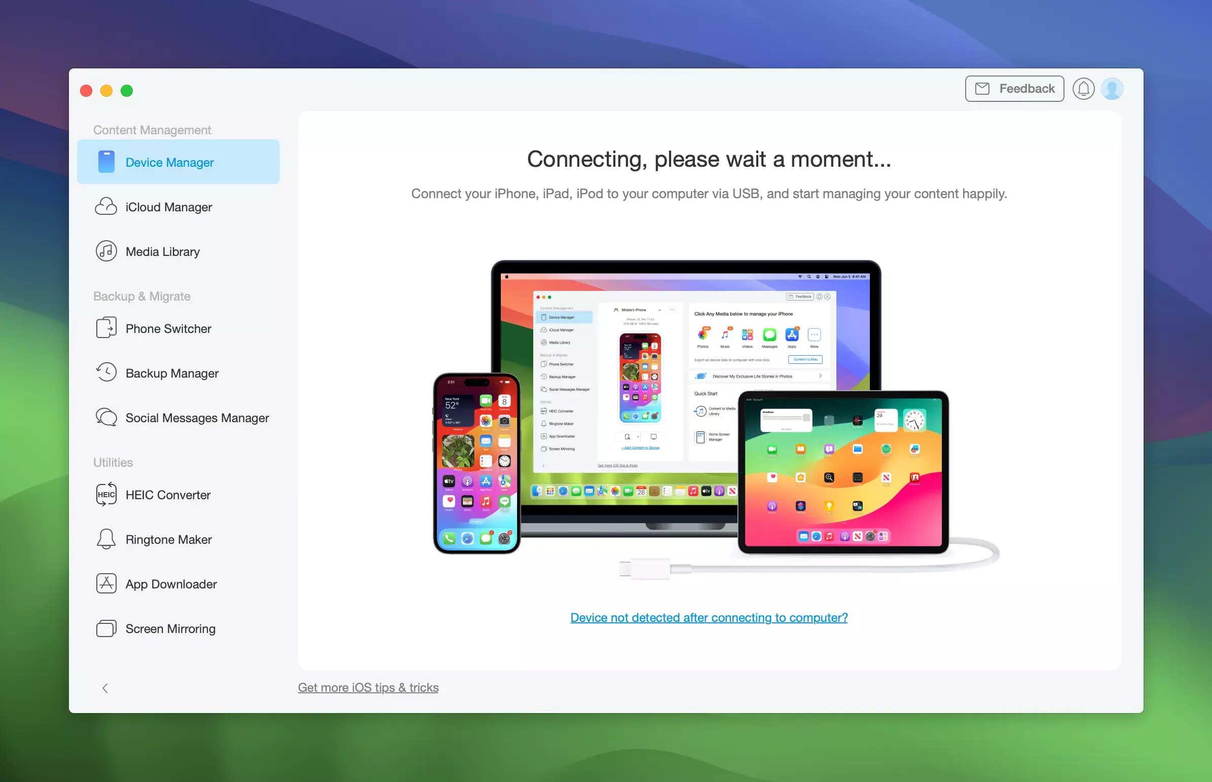 按类别将iPhone内容导出至Mac,或用一键复制你的iPad上的内容。要传输文件,只需访问AnyTrans并通过USB将你的设备连接至Mac。在设备管理器中,选择你的数据要去往的位置,并发送过去 —— 它会一路无阻地运行。